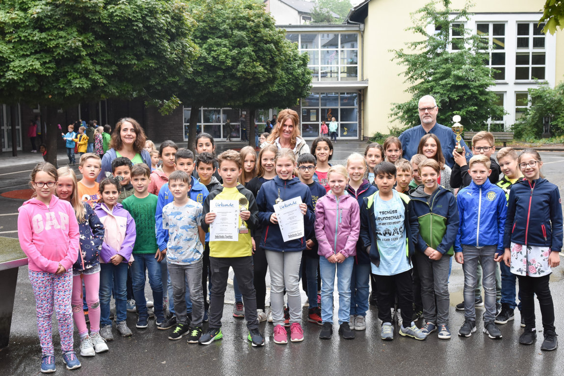 | Die Siegerehrung durch Martin Lill fand auf dem Pausenhof der Hallenschule statt. Mit den erfolgreichen Mädchen und Jungen freuten sich die Sportlehrerinnen Monica Gil de Diego und Tanja Suliani. |